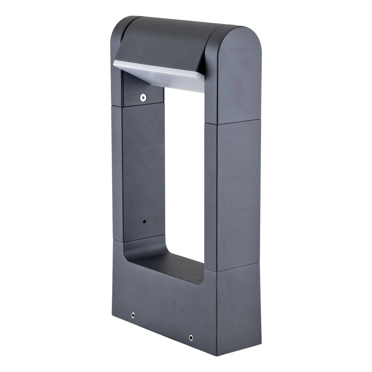 Hier handelt es sich um eine massive Pollerleuchte mit schwenkbarem Kopf, aus Aluminium im Druckgussverfahren gefertigt und pulverbeschichtet. Durch den nach Unten gerichteten Lichtaustritt entsteht bei der Leuchte keinerlei Blendeffekt.