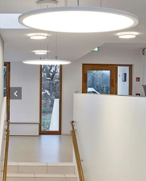 Die diffuse Lichtwirkung schafft ein einheitliches Beleuchtungsniveau und unterstützt die visuelle Wahrnehmung von horizontalen und vertikalen Raum- und Deckenflächen. Harmonische lichtstarke Lichtlösung auch für Warteräume, Aufenthaltsräume, runde Besprechungstische u.s.w.